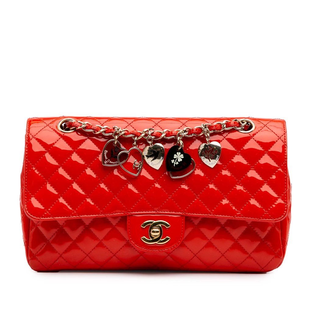 This shoulder bag features a quilted patent leather body, a leather woven chain link shoulder strap, a front flap with CC turn-lock closure, and interior zip and slip pockets.