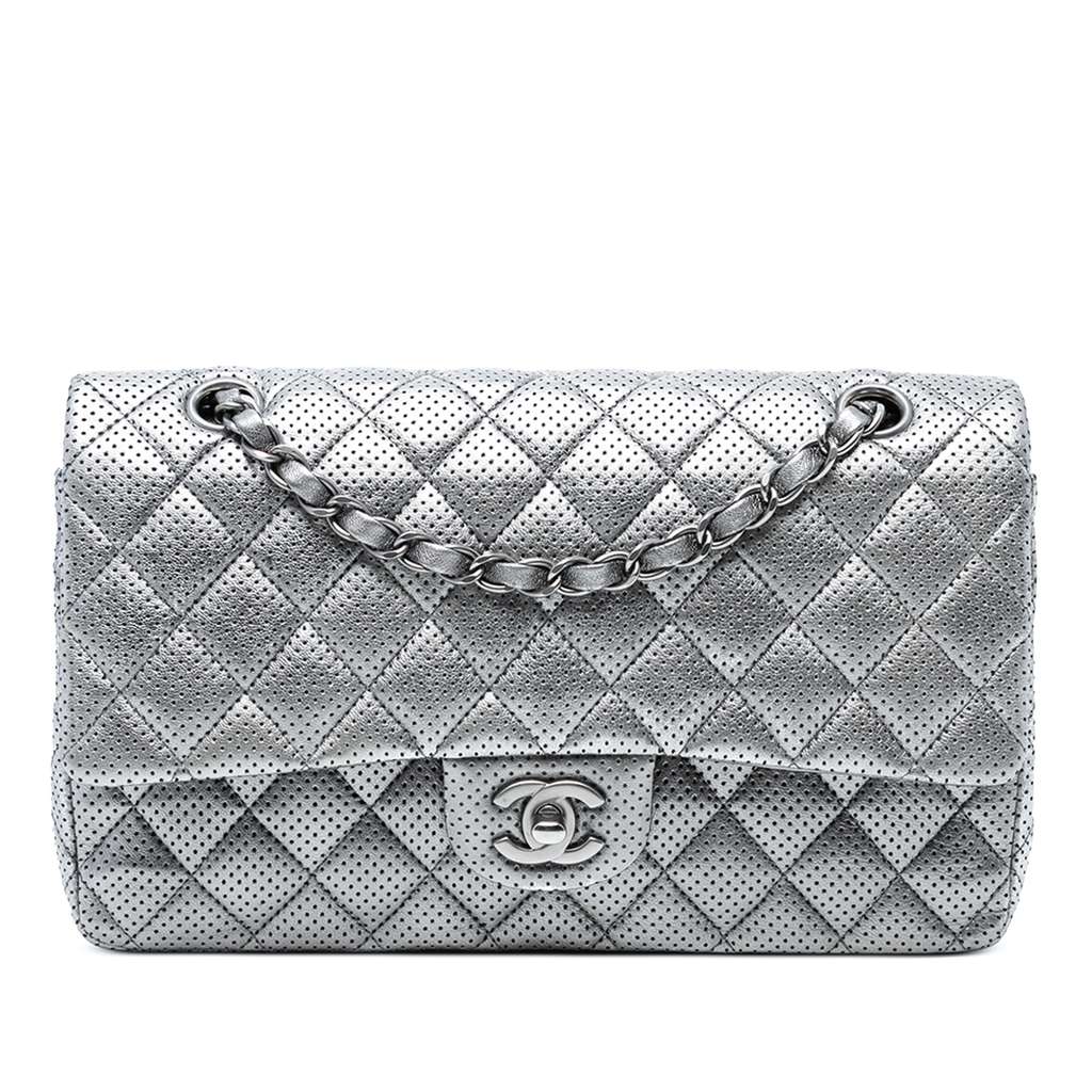This shoulder bag features a quilted perforated lambskin leather body, leather woven chain link straps, a double top flap with CC turn-lock closure, an exterior back slip pocket, and interior zip and slip pockets.
