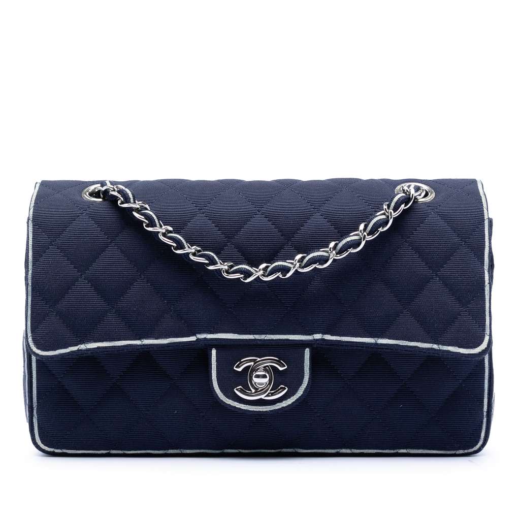 Chanel Medium Classic Printed Grosgrain Double Flap Blue Med