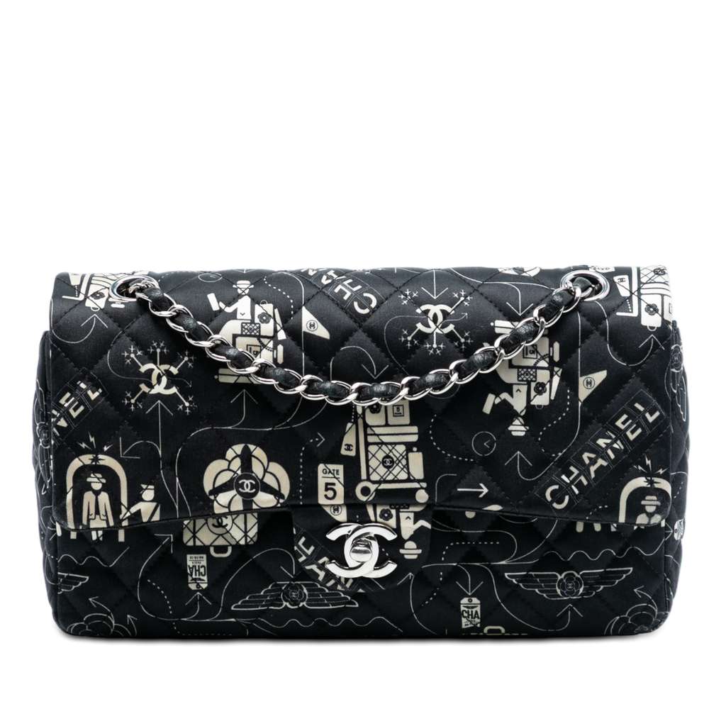 This shoulder bag features a printed satin body, leather-woven chain straps, double front flaps with CC turn-lock closure, an exterior back slip pocket, and interior zip and slip pockets.
