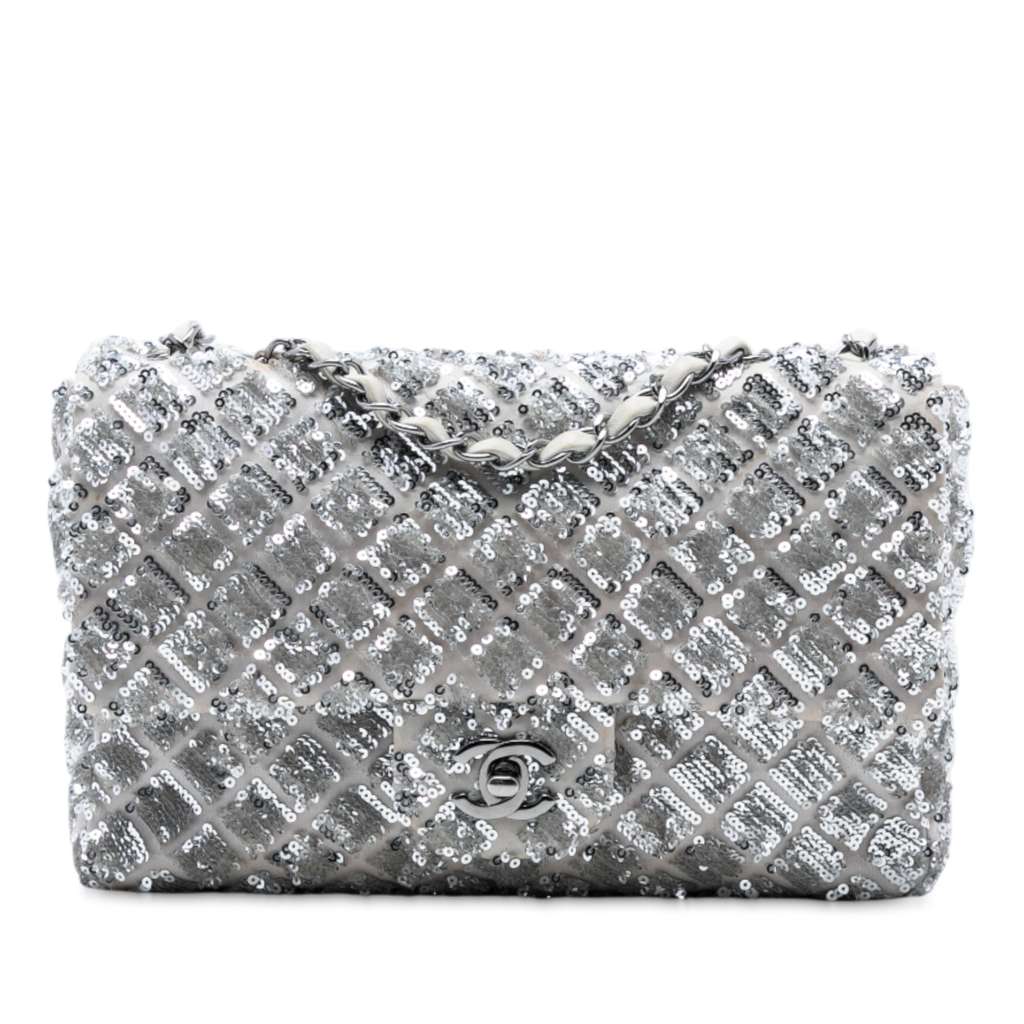 This shoulder bag features a satin body with plastic sequin details, fabric-woven chain straps, a front flap with interlocking CC twist lock closure, and an interior zip pocket.