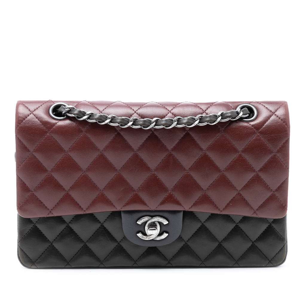 This shoulder bag features a quilted lambskin leather body, leather-woven chain straps, double front flaps with CC turn-lock closure, an exterior back slip pocket, and interior zip and slip pockets.