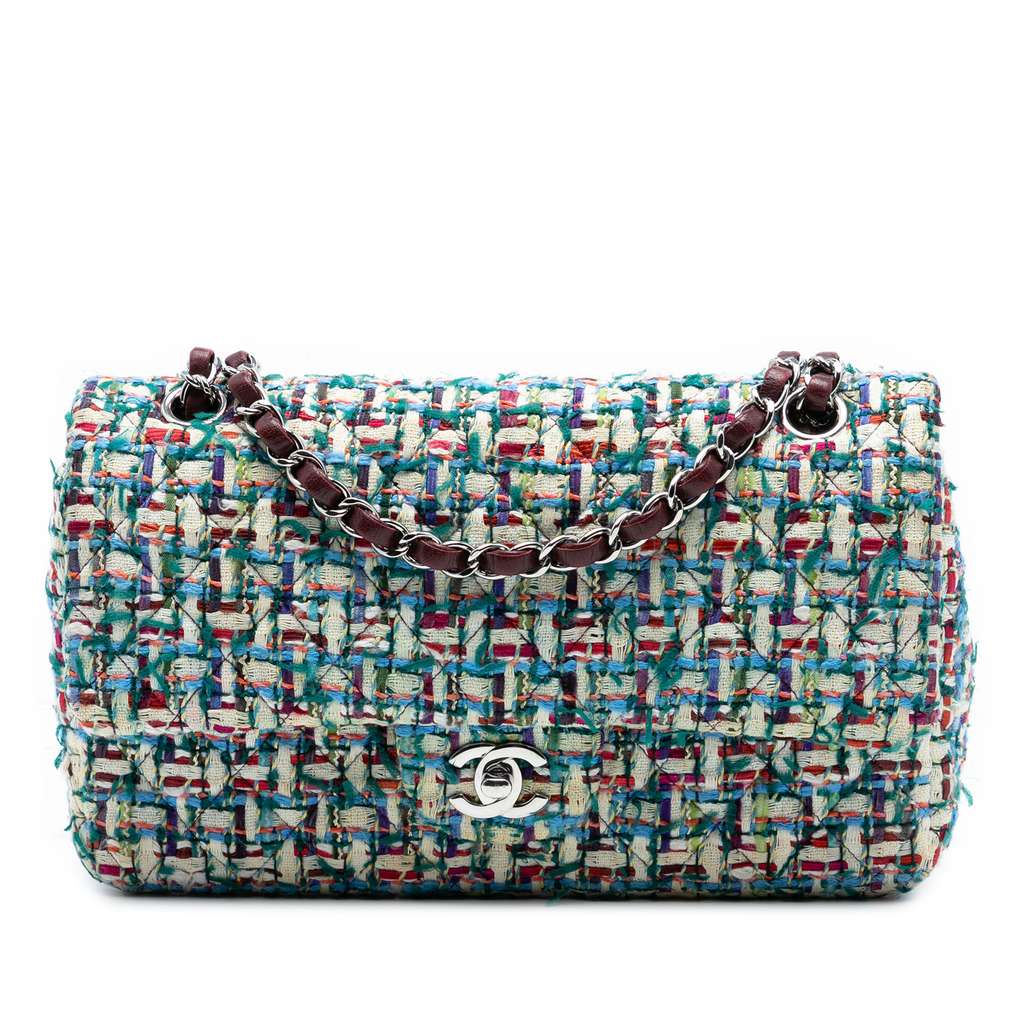 The Classic Flap Bag features a tweed body, leather woven chain link straps, double front flaps with CC turn-lock closure, an exterior back slip pocket, and interior slip pockets.
