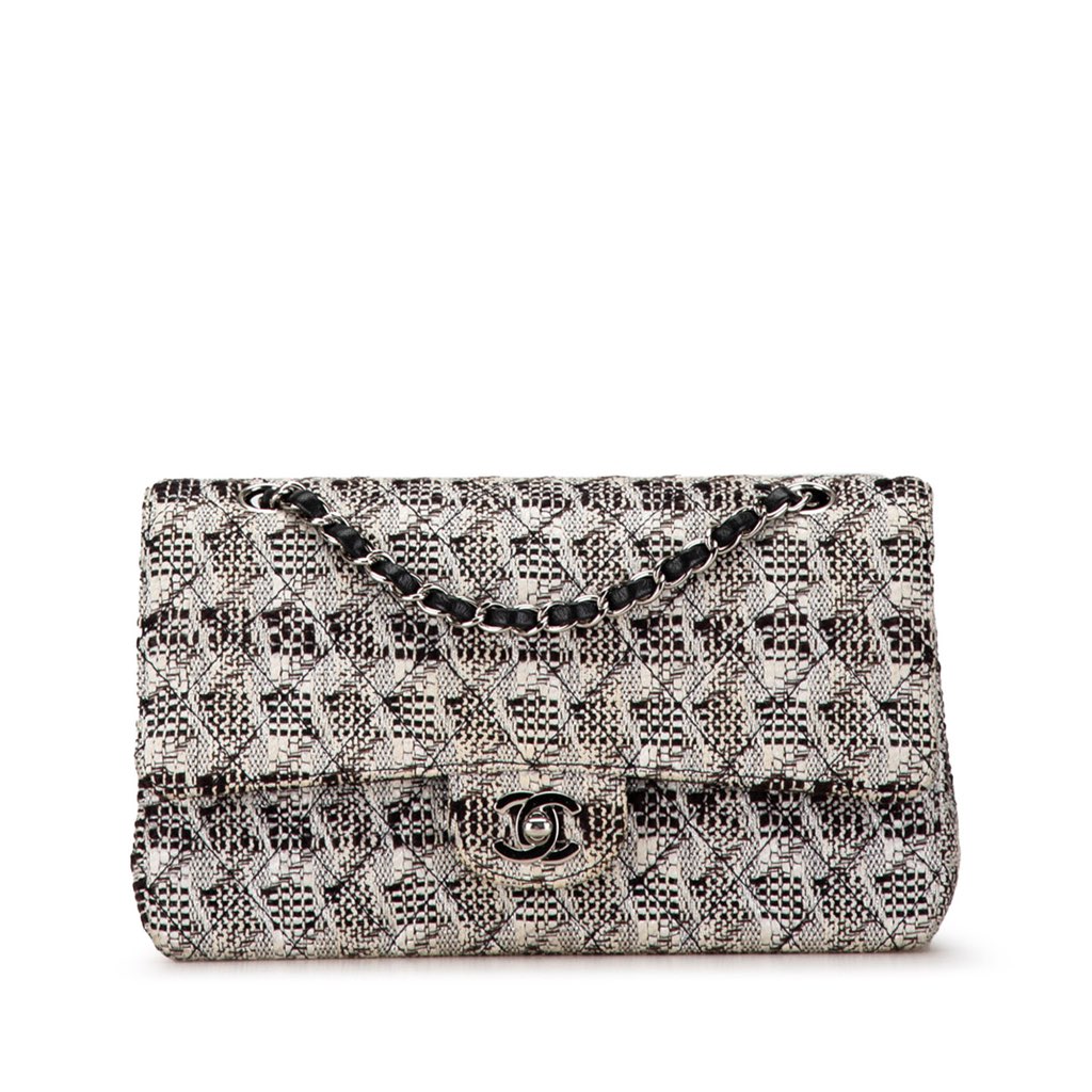 This shoulder bag features a tweed body, leather woven chain straps, front double flaps with a CC logo turn lock closure, an exterior back slip pocket, and interior zip and slip pockets.