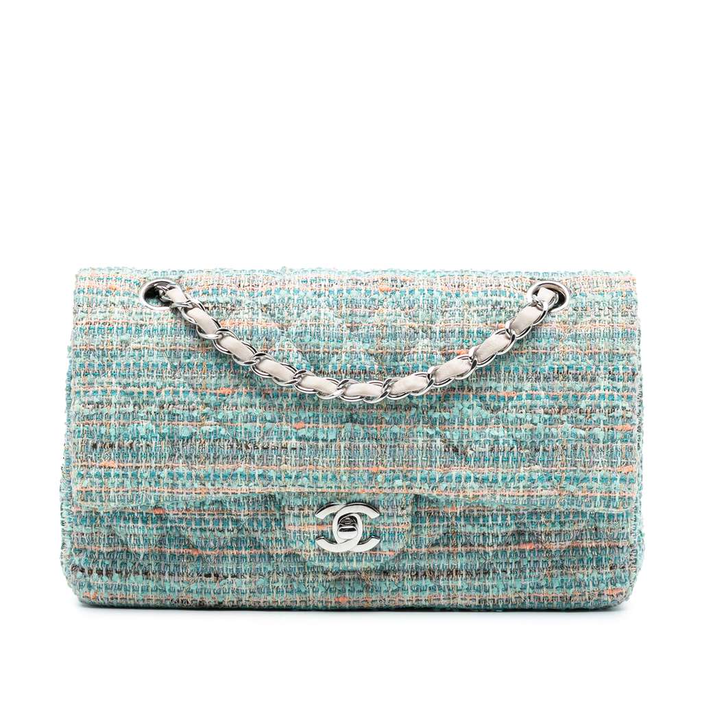 This shoulder bag features a quilted tweed body, leather woven chain-link shoulder straps, front flaps with interlocking Cs and a twist-lock closure, an exterior back slip pocket, and interior zip and slip pockets.
