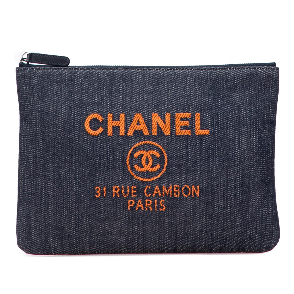 This clutch features a denim body and a top zip closure.