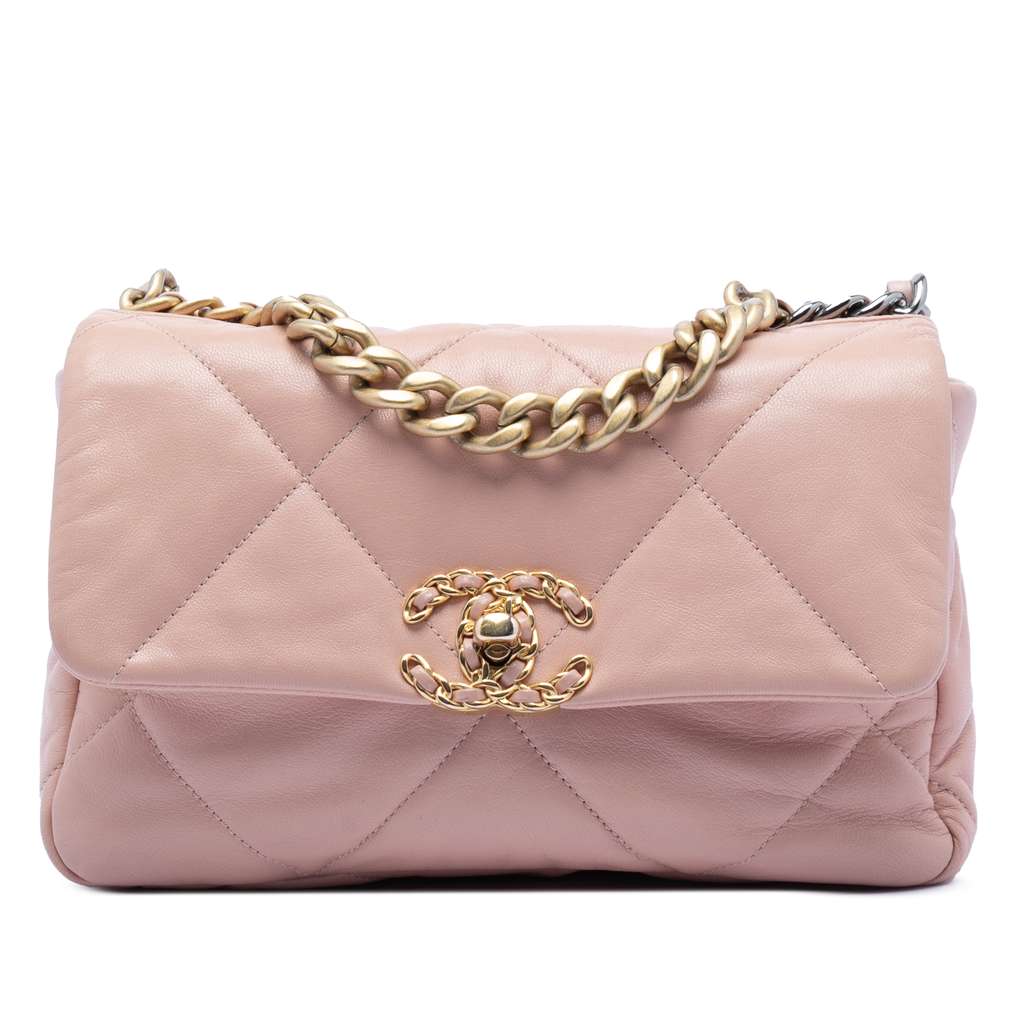 The Medium 19 Flap Bag features a quilted lambskin leather body, a gold-tone chain handle, a woven leather chain shoulder strap, a front flap with twist-lock closure, an exterior back slip pocket, and an interior zip pocket.