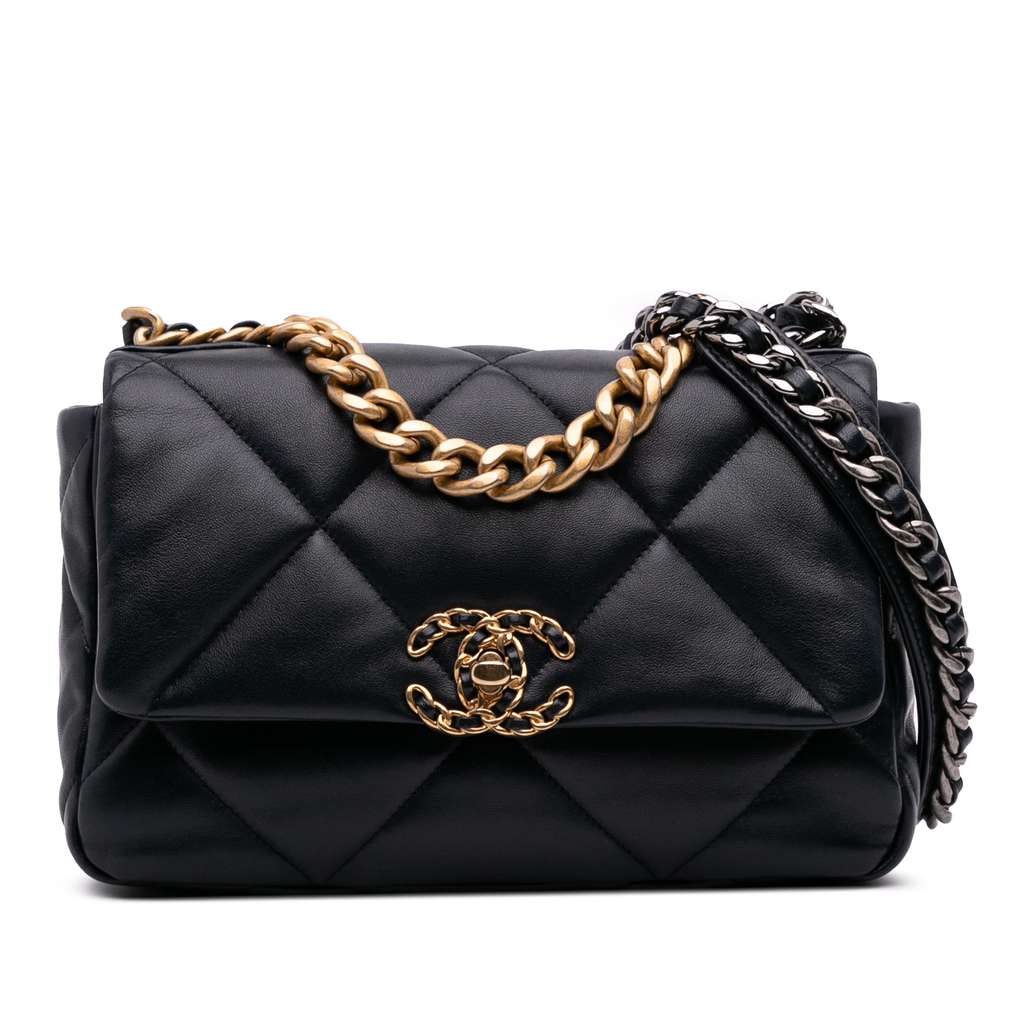 The Large 19 Flap bag features a quilted lambskin leather body, a gold-tone chain handle, a woven leather chain shoulder strap, a flap with a CC twist lock closure, an exterior slip pocket, and an interior zip pocket.