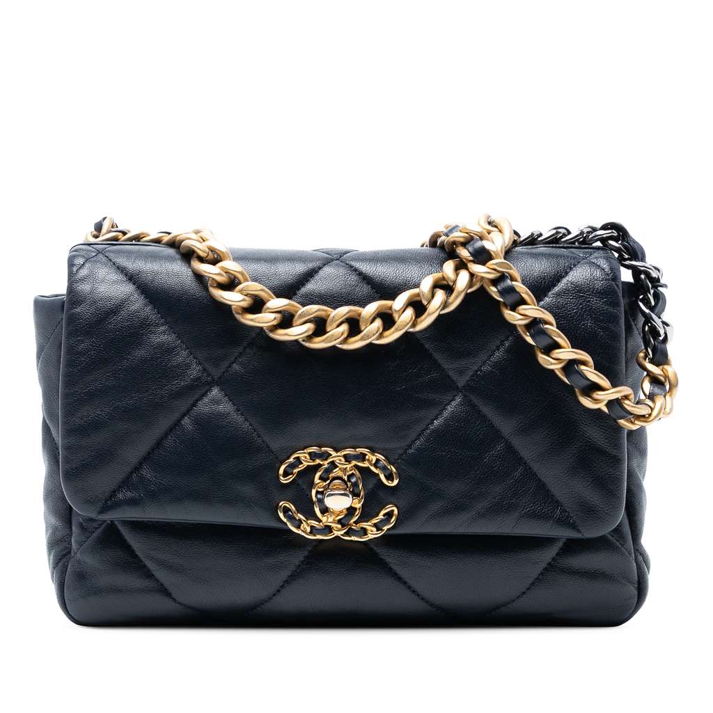 The Medium 19 Flap bag features a quilted lambskin leather body, a gold-tone chain handle, a leather woven chain shoulder strap, a flap with a CC twist lock closure, an exterior back slip pocket, and an interior zip pocket.