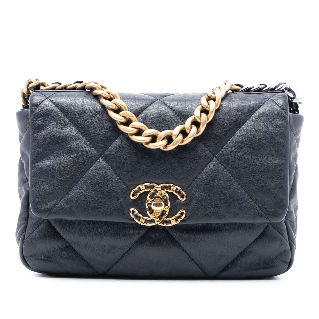The 19 Flap bag features a quilted lambskin leather body, a gold-tone chain handle, a woven leather chain shoulder strap, a flap with a CC twist lock closure, an exterior slip pocket, and an interior zip pocket.