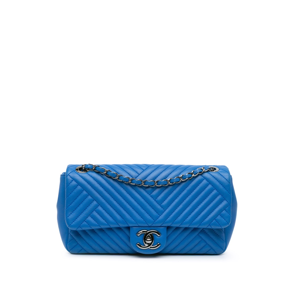 This shoulder bag features a quilted lambskin leather body, leather woven chain link straps with leather guard, a front flap with a CC turn lock closure, and an interior zip pocket.