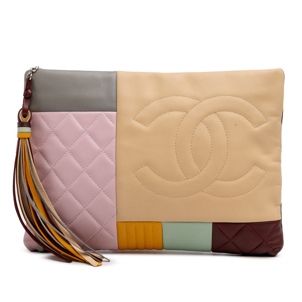 This clutch bag features a patchwork lambskin leather body, and a top zip closure.