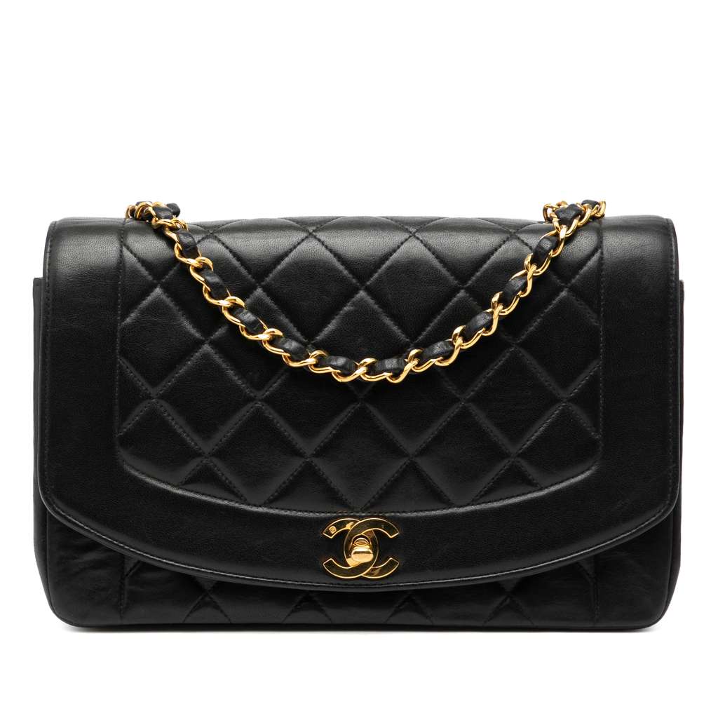 The Diana flap bag features a lambskin leather body, a leather-woven chain shoulder strap, a front flap with interlocking Cs and twist lock closure, and interior zip and slip pockets.