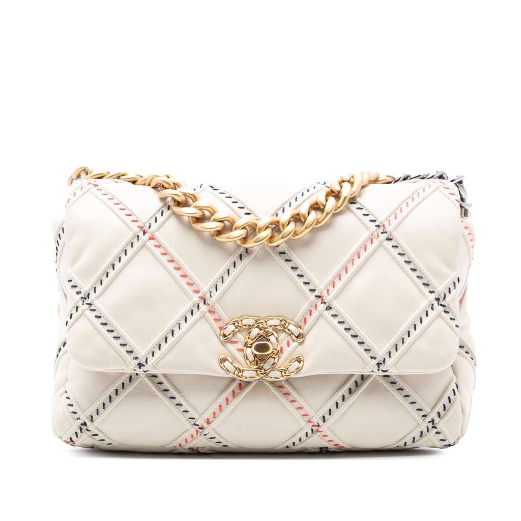 This 19 Flap features a stitched lambskin leather body, a chain handle, a leather woven chain shoulder strap, a front flap with turn lock closure, an exterior back slip pocket, and an interior zip pocket. Corners has been repainted.