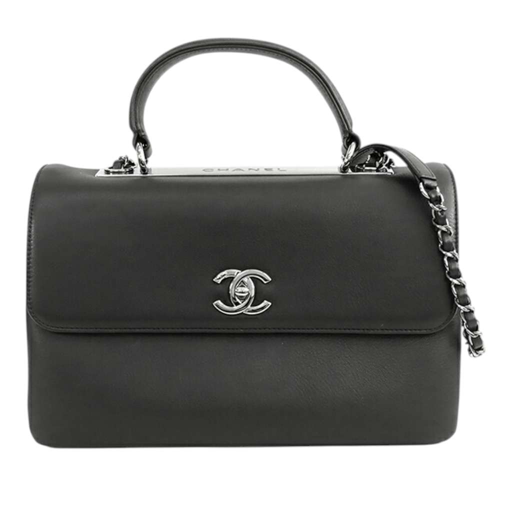 The Trendy CC satchel features a lambskin leather body, a flat leather top handle, a detachable leather-woven chain link strap with leather guard, a front flap with CC turn-lock closure, an exterior back slip pocket, and interior zip and slip pockets.
