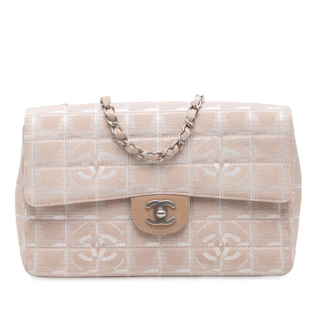 This shoulder bag features a nylon body, nylon woven chain link straps, a front flap with interlocking Cs and a twist lock closure, an exterior back slip pocket, and interior slip and zip pockets.