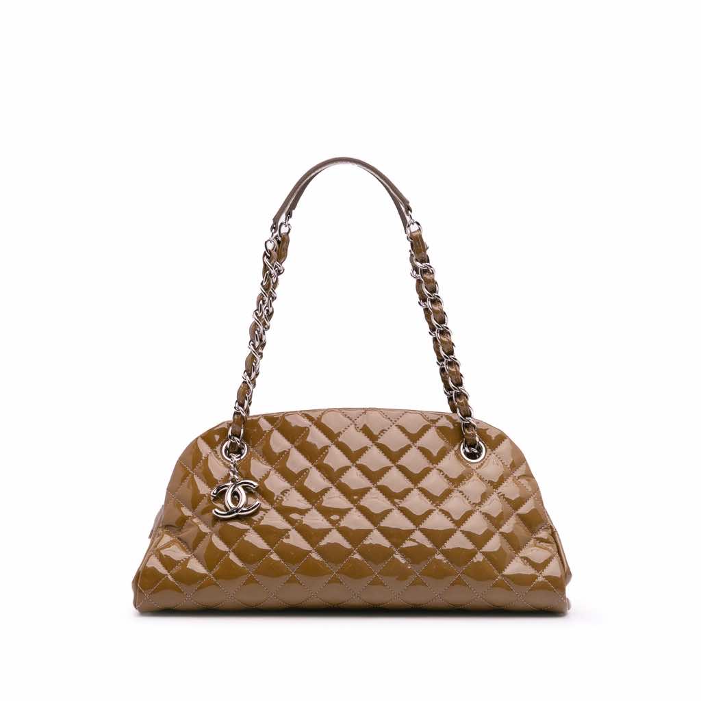 The Just Mademoiselle features a quilted patent leather body, leather woven chain shoulder straps with leather guard, an open top, an interior center zip compartment, and interior zip and slip pockets.