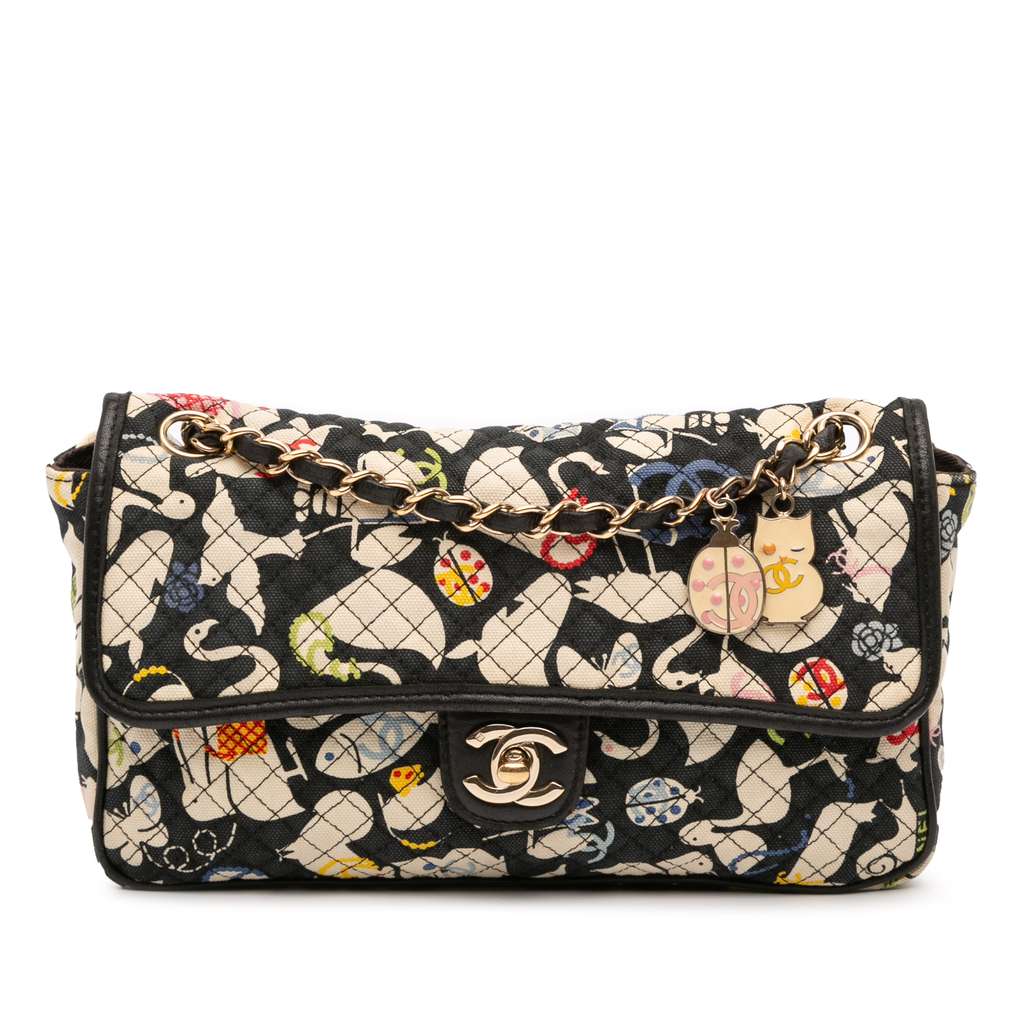 This shoulder bag features a printed canvas body with leather trim, a leather woven chain strap, a front flap with turn lock closure, and an interior zip pocket.