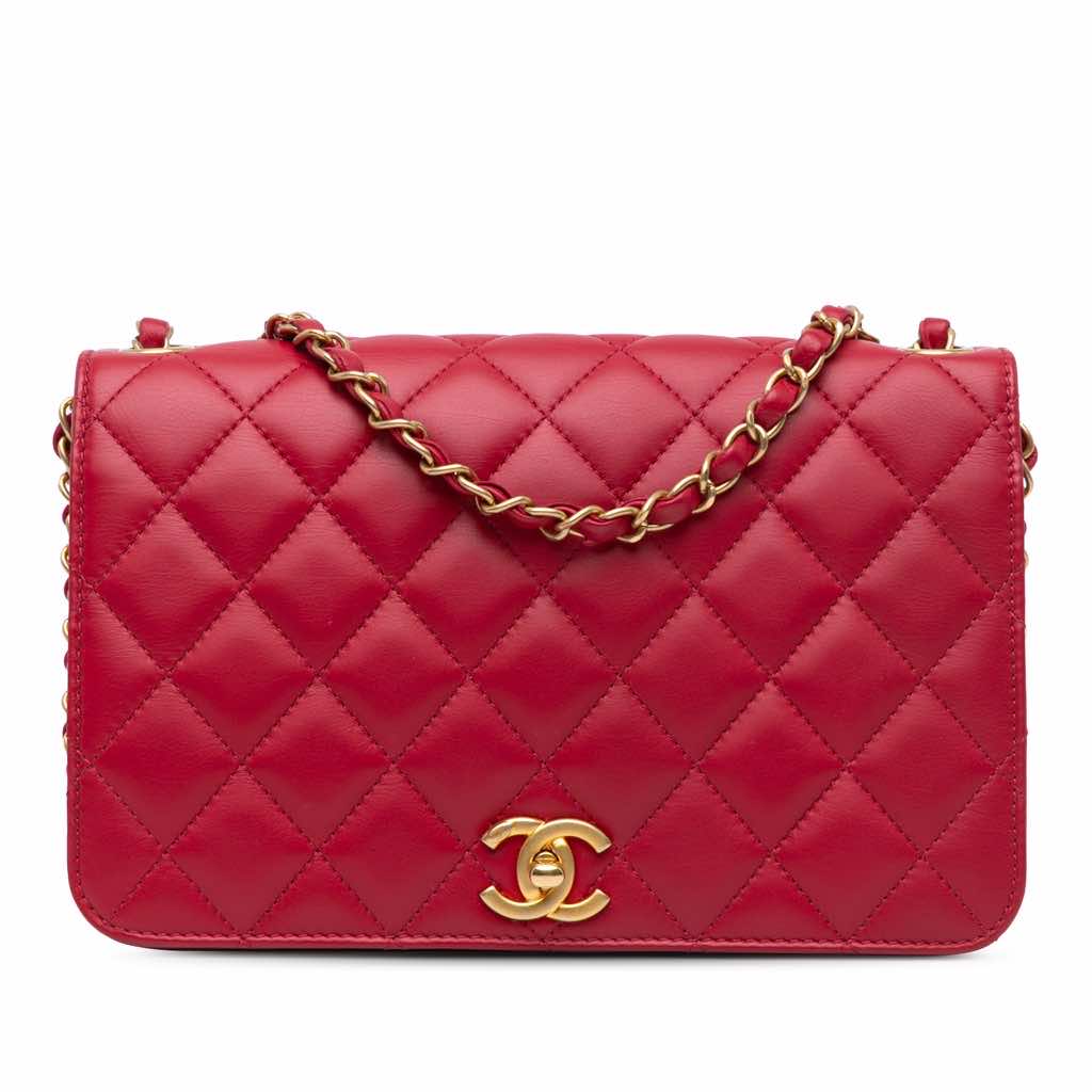 This crossbody bag features a quilted leather body, a leather-woven chain shoulder strap, a front flap with CC turn-lock closure, an exterior slip pocket, and an interior slip pocket.