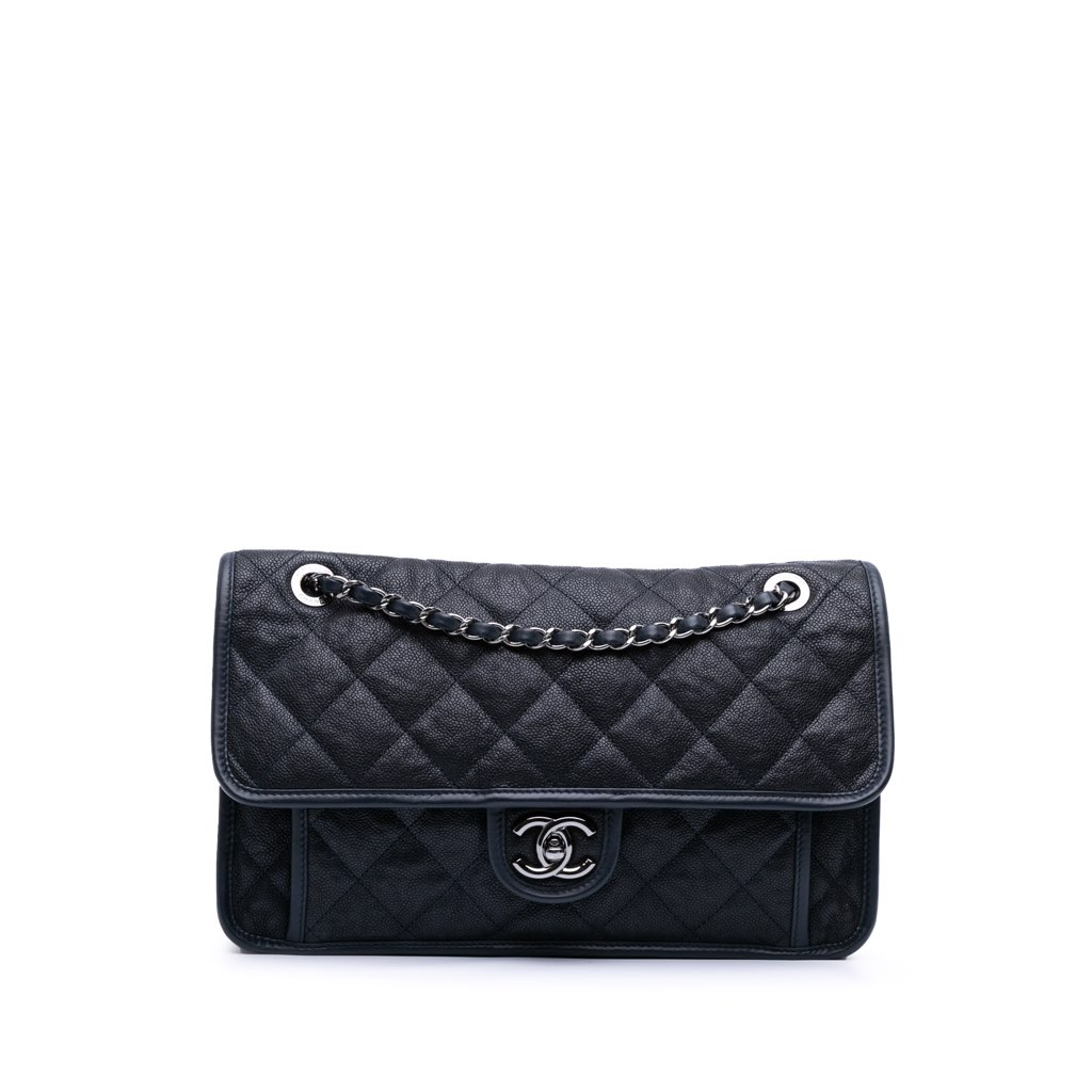 The French Riviera flap bag features a quilted leather body, leather-woven chain straps, a flap with interlocking CC turn lock closure, and an interior zip pocket.