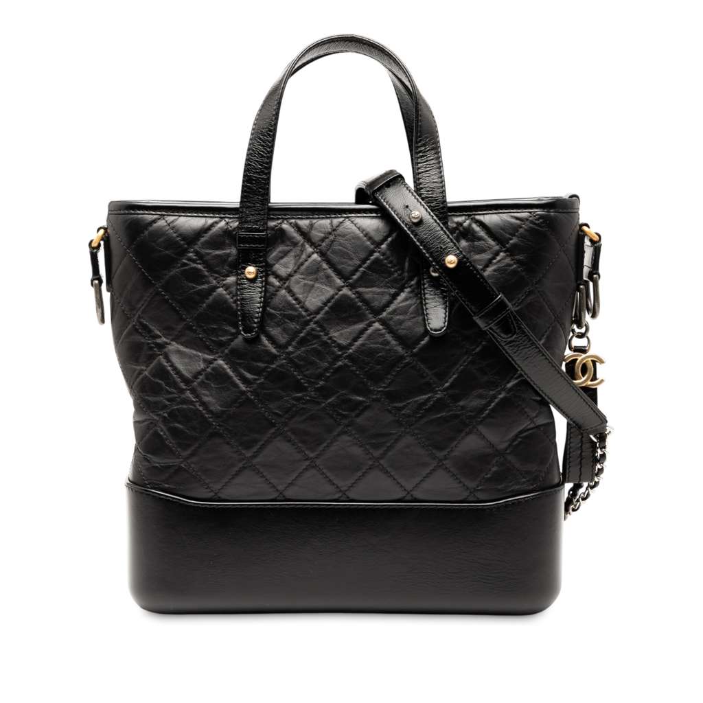 This satchel features a quilted calf leather body, flat leather handles, a detachable leather woven chain strap, a top zip closure, and interior zip and slip pockets.