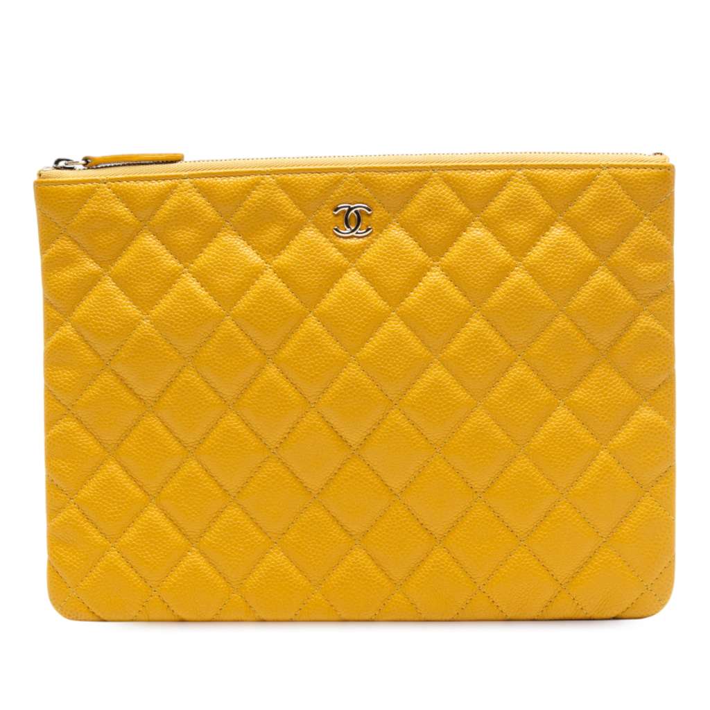 This clutch bag features a quilted caviar leather body, a top zip closure, an exterior back slip pocket, and an interior zip pocket.
