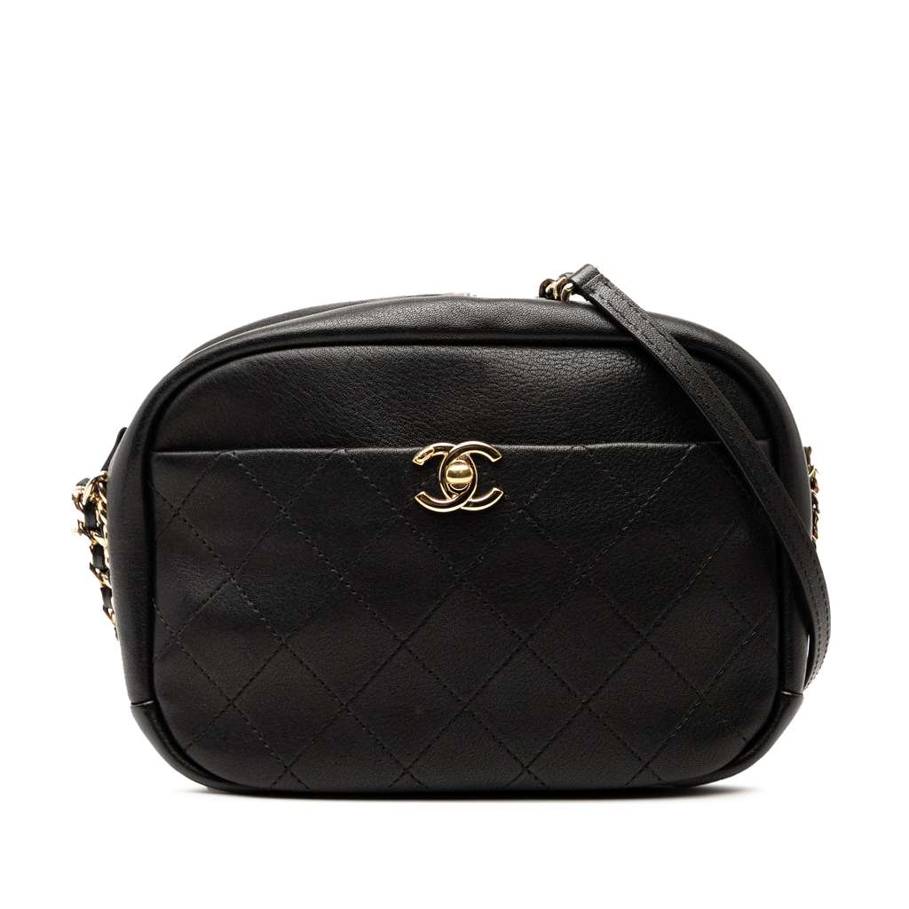 This crossbody bag features a goatskin leather body, a leather-woven chain strap with leather guard, a top zip closure, an exterior slip pocket with CC turn lock closure, and an interior zip pocket.
