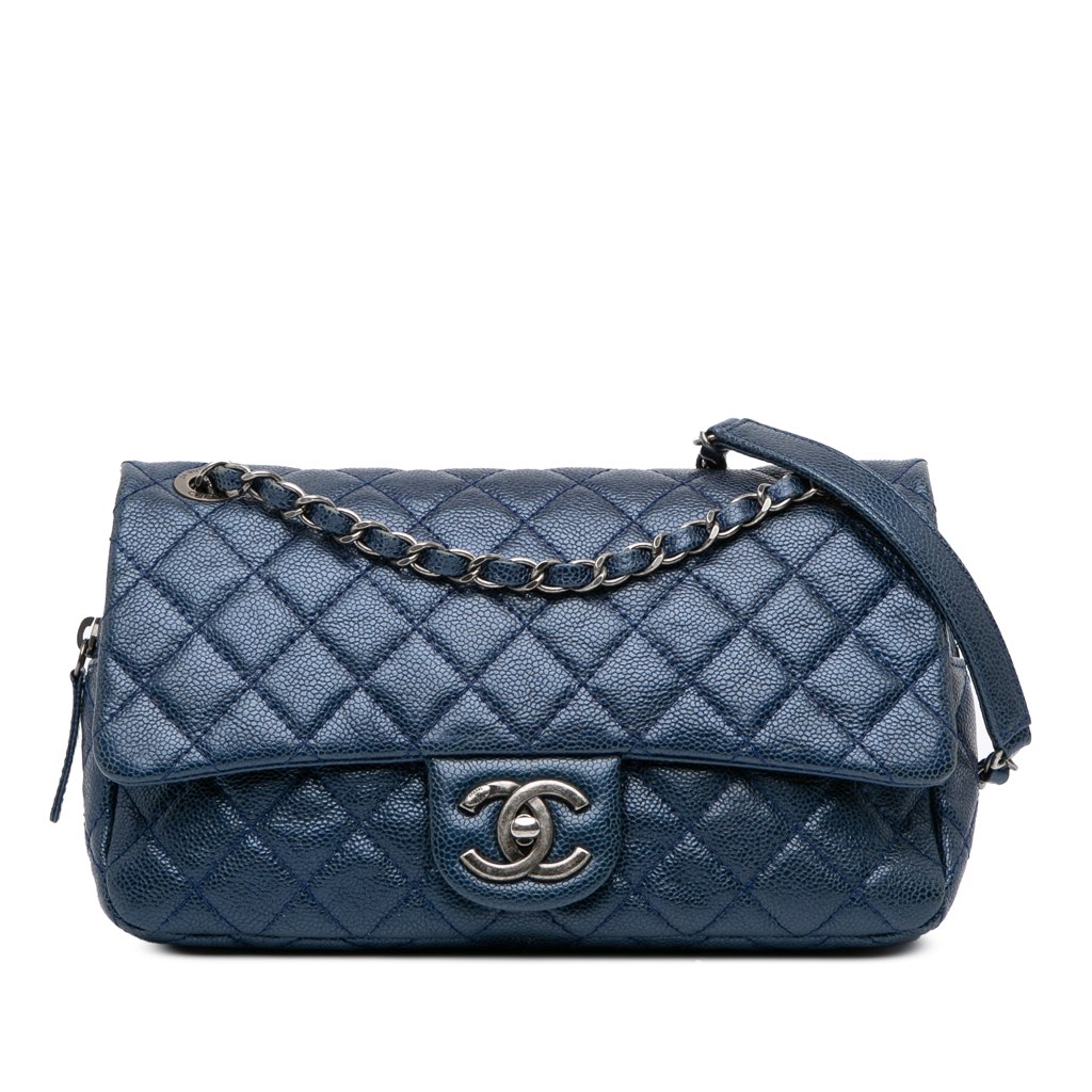This crossbody bag features a quilted caviar leather body, a leather woven chain strap, a flap with CC turn-lock closure, a top zip closure, and an interior zip pocket.