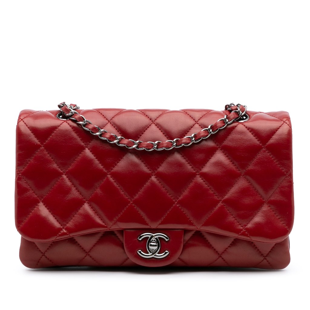 This flap bag features a lambskin leather body, a leather woven chain shoulder strap, a front flap with turn lock closure, an exterior back slip pocket, three interior compartments, and interior zip and slip pockets.