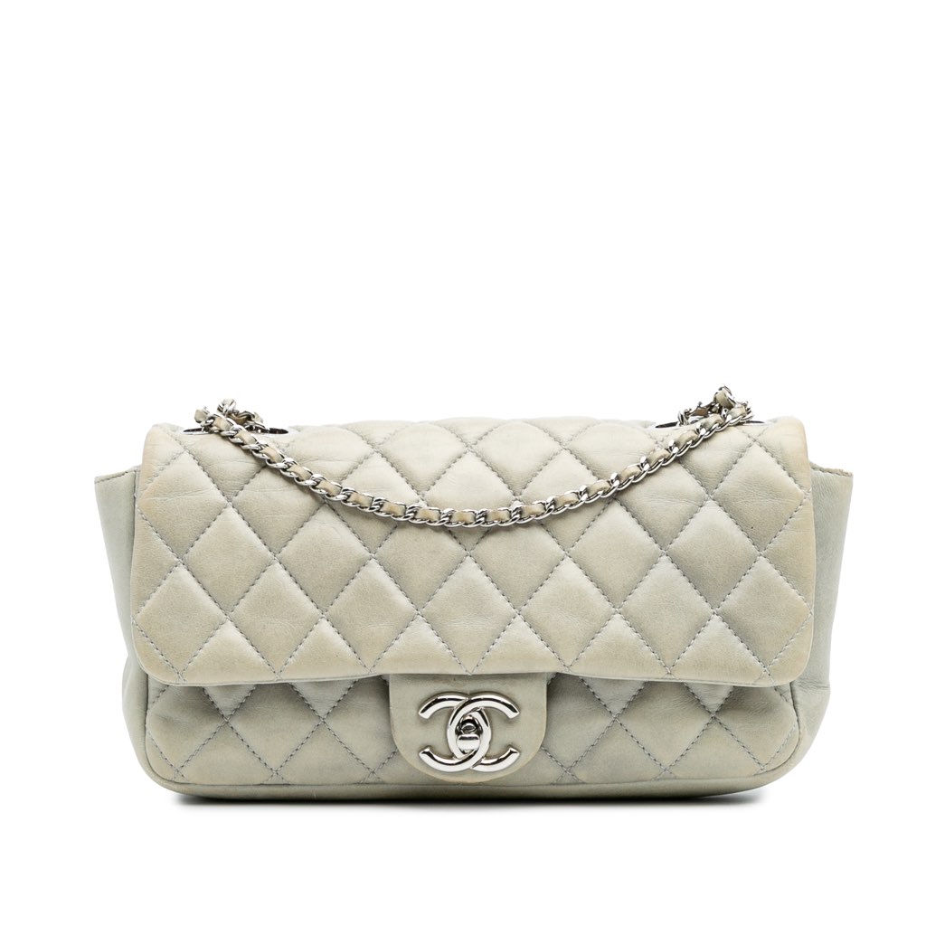 This flap bag features a quilted lambskin leather body, leather woven chain link shoulder straps, a front flap with turn lock closure, an exterior back zip pocket, and an interior zip pocket.