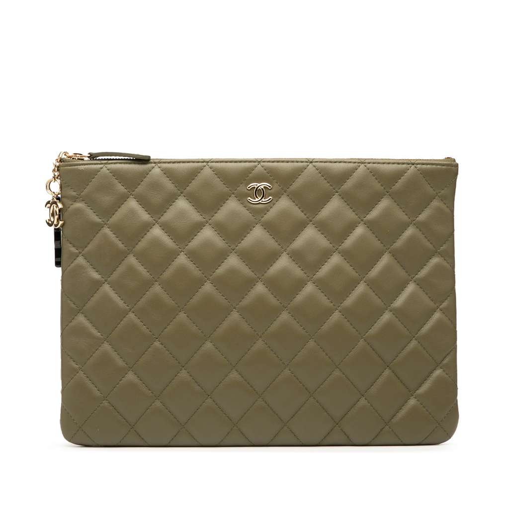 This clutch bag features a quilted lambskin leather body, a top zip closure, an exterior slip pocket, and an interior zip pocket.