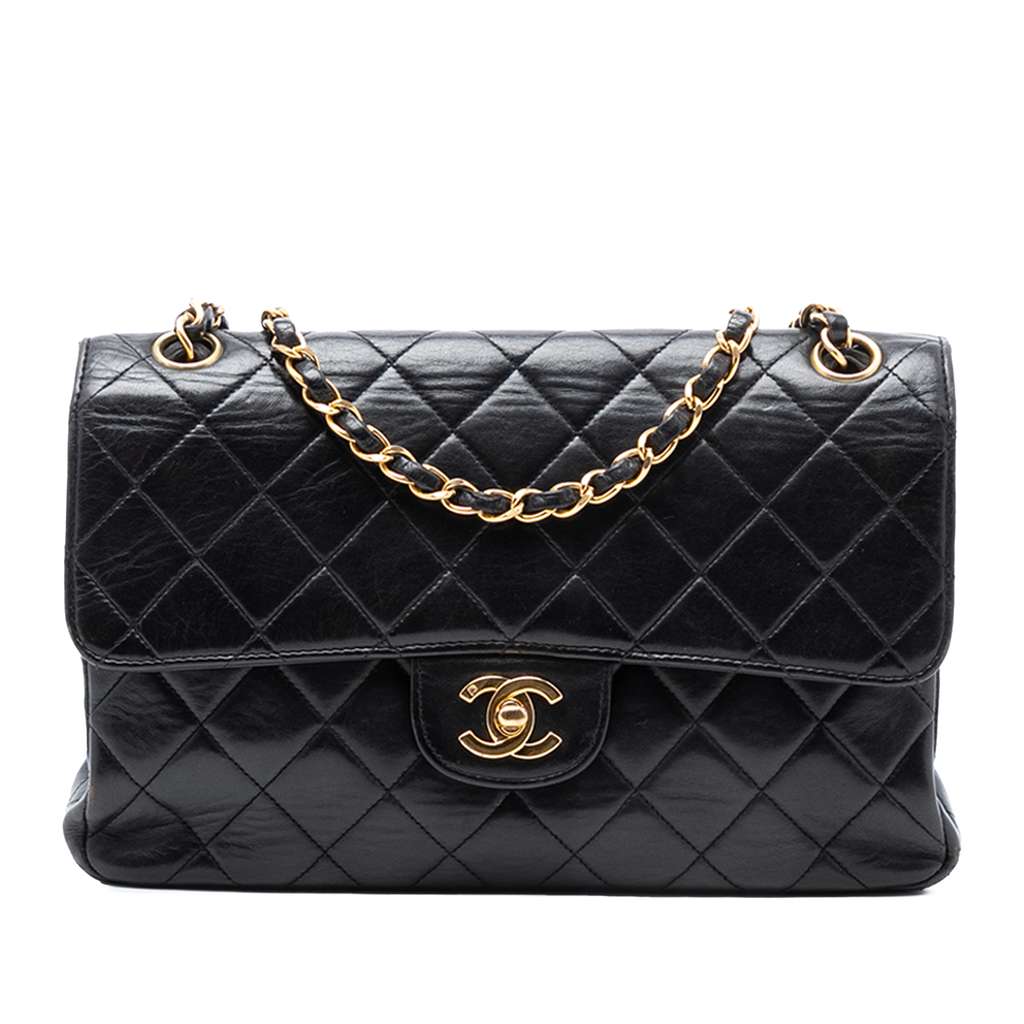 This shoulder bag features a quilted lambskin body, leather woven chain straps, double sided flaps with interlocking Cs and a twist lock closure, and interior zip and slip pockets.