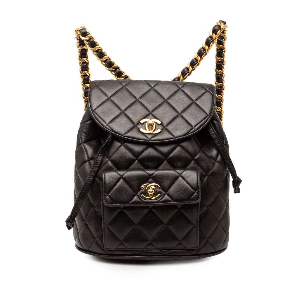 The Duma backpack features a quilted lambskin leather body, leather woven back straps, a front flap with twist lock closure, a drawstring closure, and an exterior front flap pocket with twist lock closure.