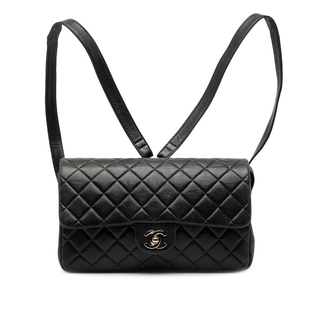 This backpack features a quilted lambskin leather body, flat leather and chain back straps, a front flap with CC turn lock closure, an exterior back slip pocket, and interior zip and slip pockets.