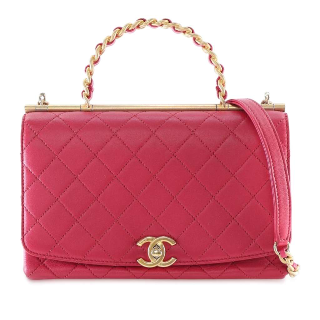 This satchel features a quilted lambskin leather body, a leather woven metal handle, a leather woven chain strap, a front flap with twist lock closure, and an interior zip pocket.