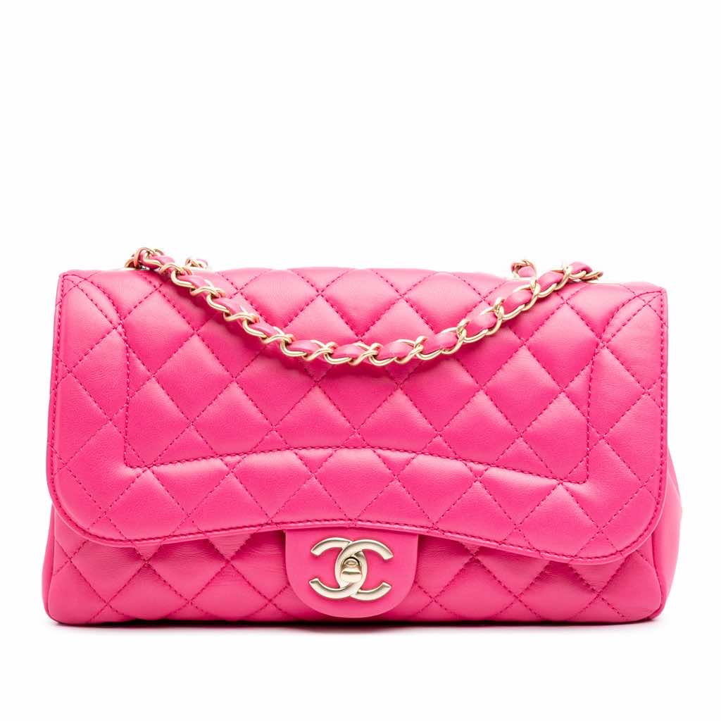 This shoulder bag features a quilted lambskin body, leather woven chain shoulder straps, a front flap with interlocking Cs and a twist lock closure, an exterior back slip pocket, and interior zip pocket.