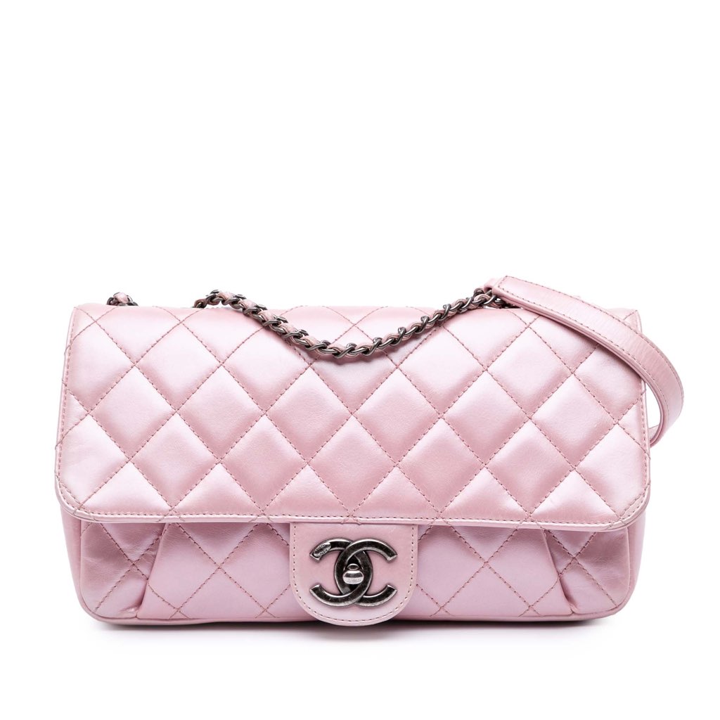 This crossbody bag features a quilted calfskin body, a leather woven chain strap with flat leather shoulder guard, a front flap with a CC turn lock closure, and interior zip and slip pockets.