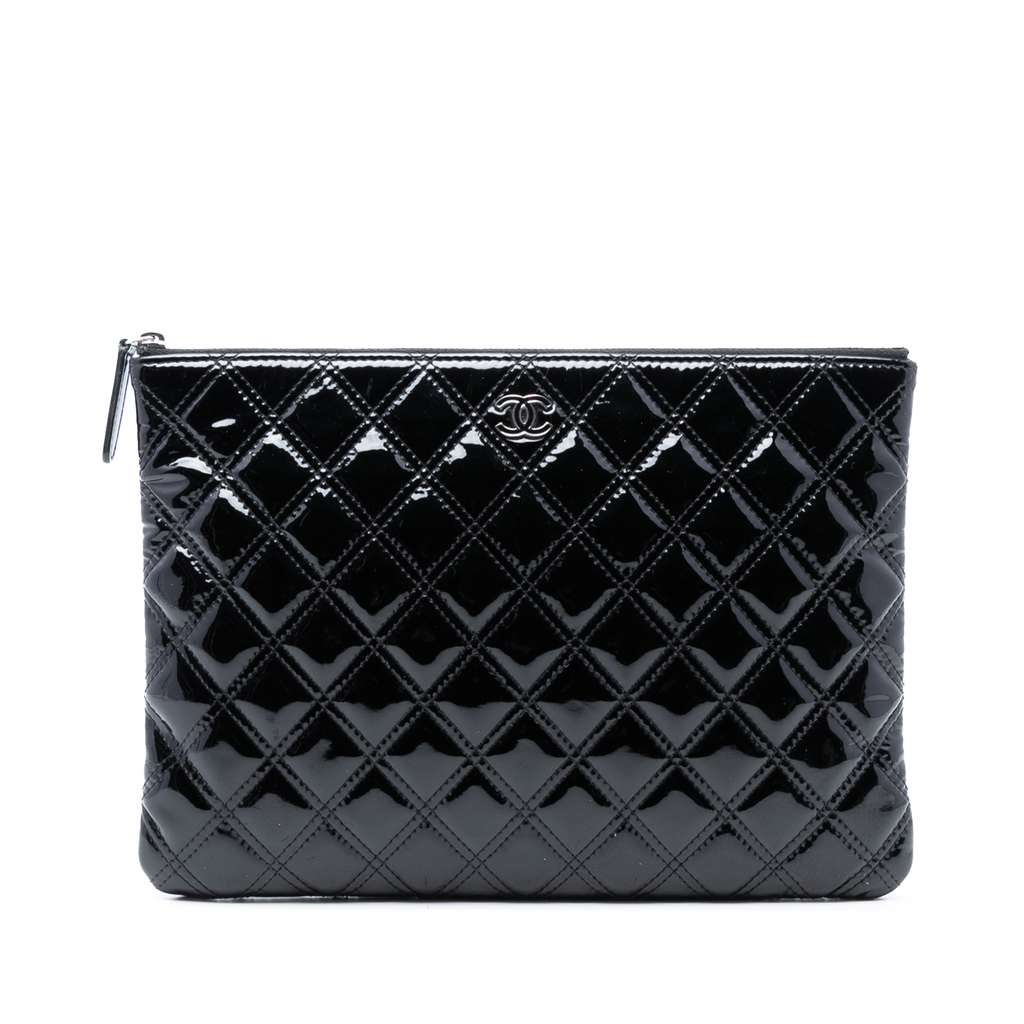 This clutch bag features a quilted patent leather body and a top zip closure.