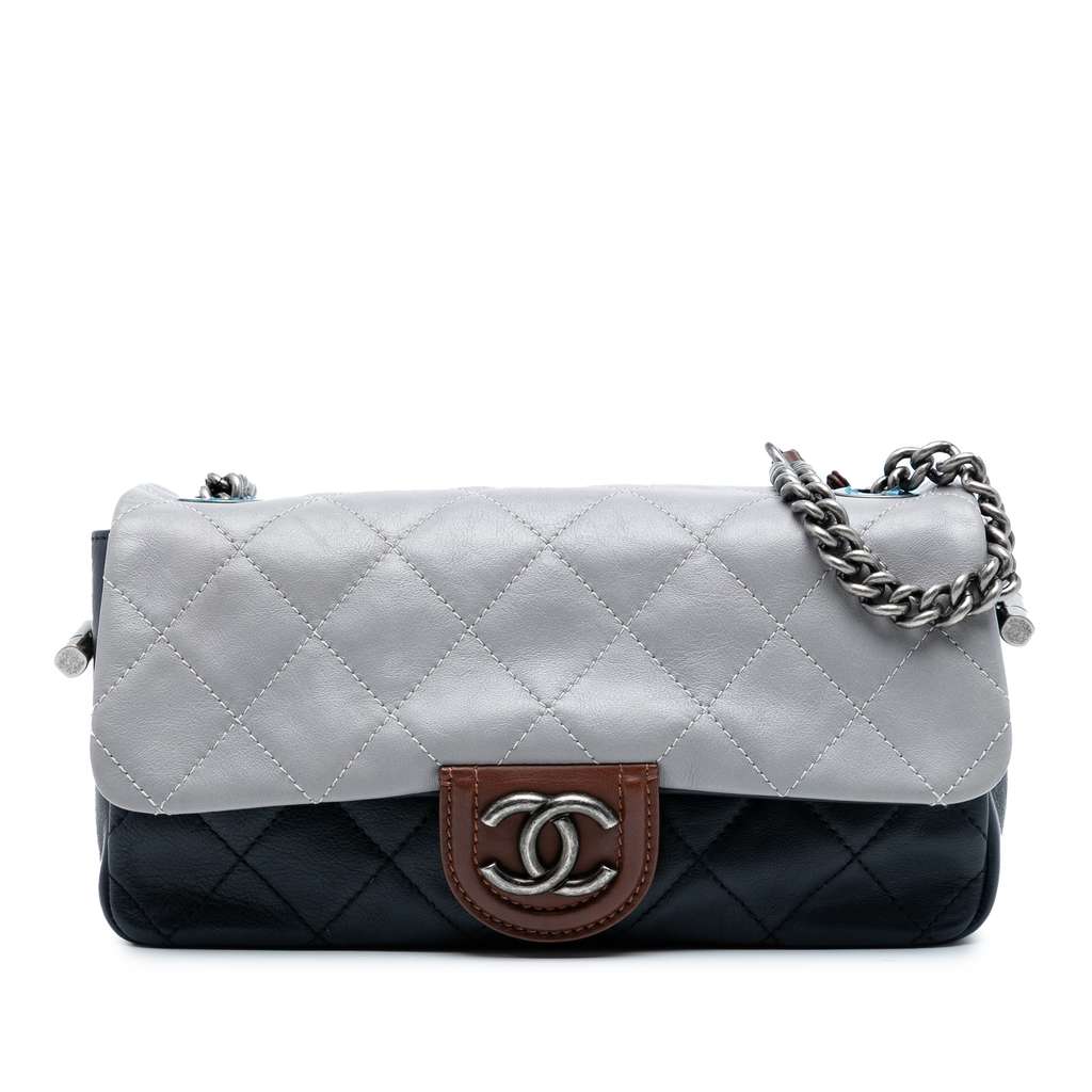 This shoulder bag features a quilted lambskin leather body, a chain link strap with leather shoulder guard, a front flap with magnetic snap button closure, and an interior zip pocket.