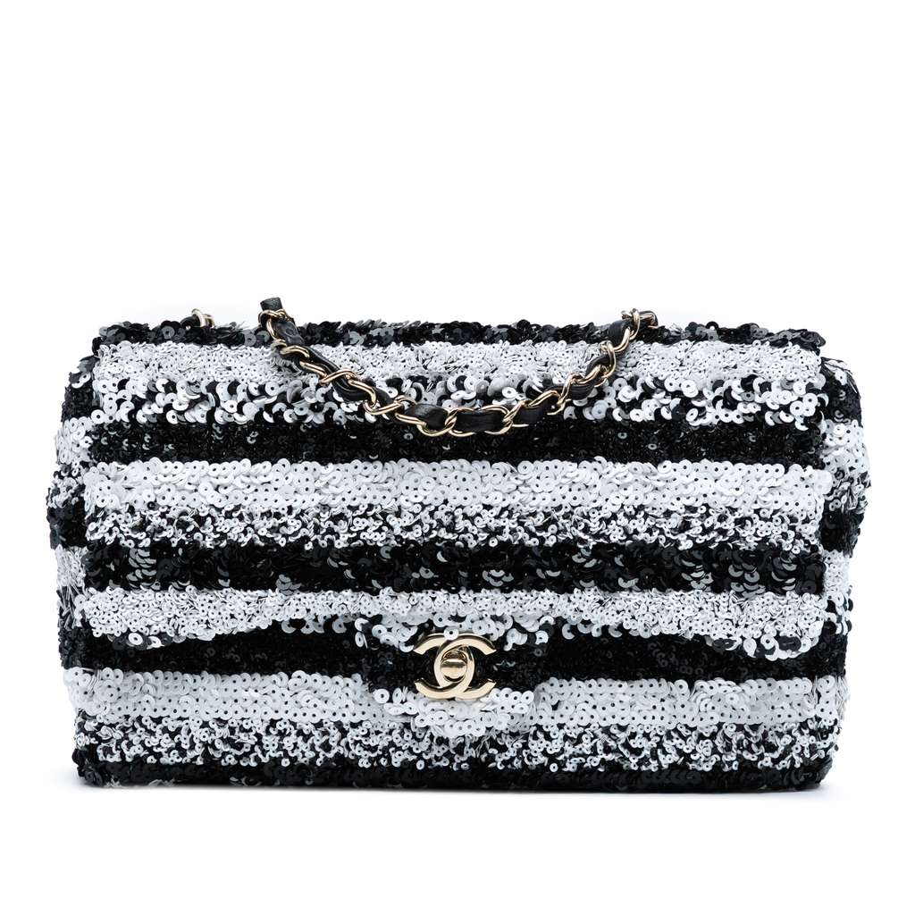 This flap bag features a sequined leather body, leather-woven chain straps, a front flap with CC turn lock closure, and interior zip and slip pockets.