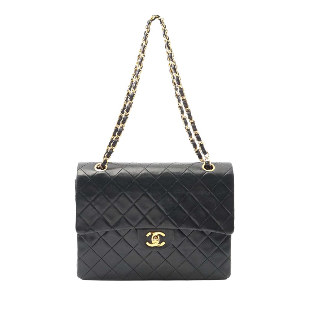 This shoulder bag features a quilted lambskin body, leather woven chain straps, double front flaps with interlocking Cs and a twist lock closure, an exterior back slip pocket, and interior zip and slip pockets.