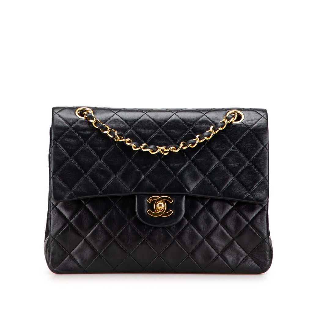 This shoulder bag features a quilted lambskin body, leather woven chain straps, double front flaps with interlocking Cs and a twist lock closure, an exterior back slip pocket, and interior zip and slip pockets.