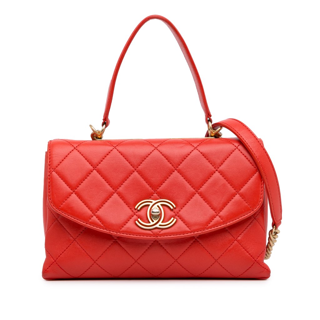 This satchel features a quilted lambskin leather body, a flat leather top handle, a gold-tone chain strap with leather guard, a front flap with CC turn-lock closure, and an interior slip pocket.