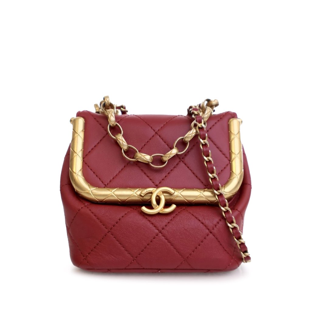 This satchel features a quilted lambskin leather body, a chain link handle, a leather woven chain link strap, a top flap with metal kiss lock closure, an exterior back slip pocket, and an interior slip pocket.