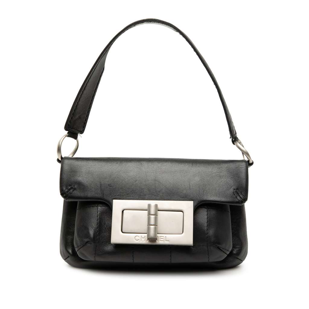 This handbag features a leather body, a flat leather strap, and a front flap with twist lock closure.