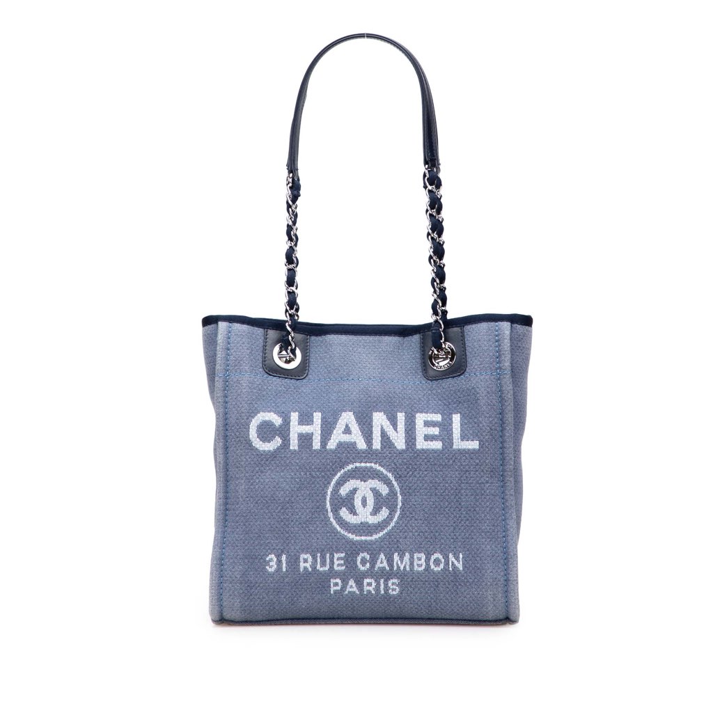 The Deauville features a canvas body, leather woven chain shoulder straps with leather guard, an open top with magnetic snap closure, and interior zip and slip pockets.