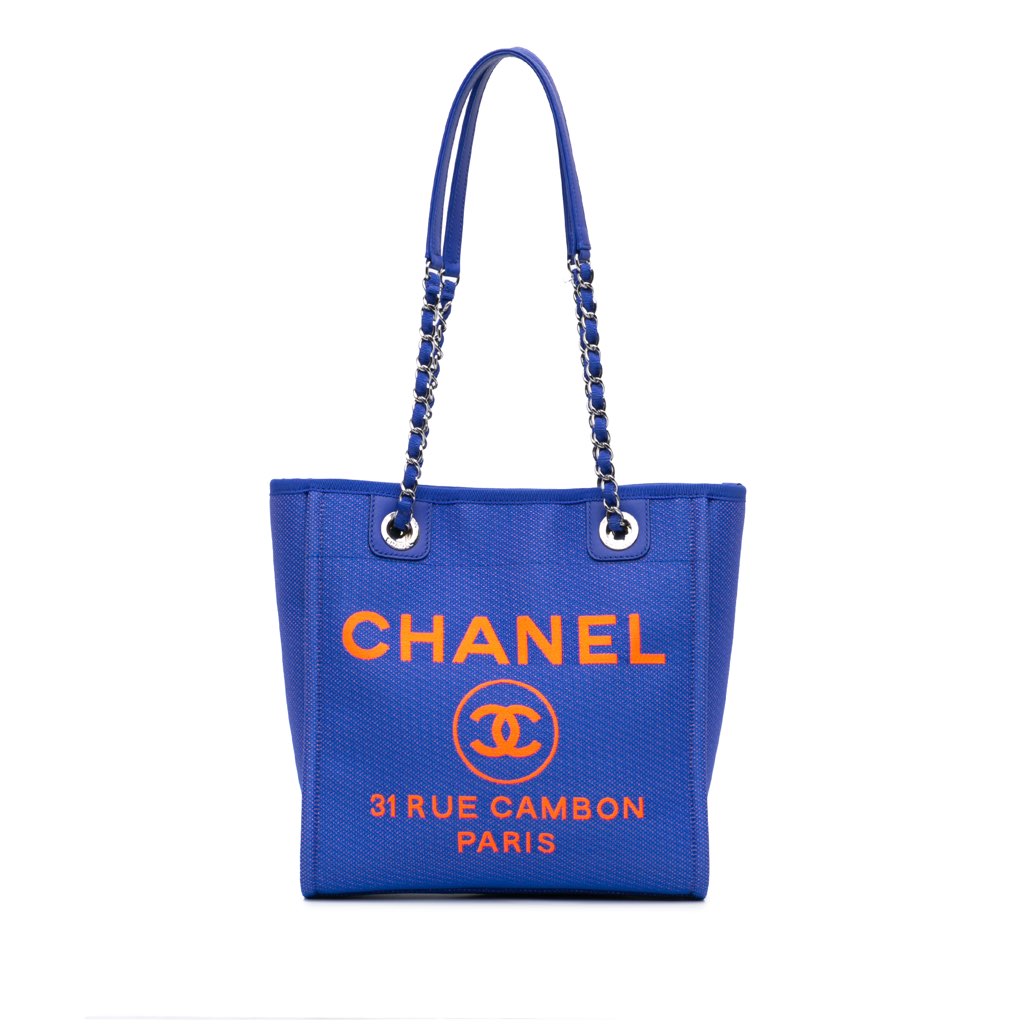 The Deauville tote bag features a canvas body with leather trim, curb chain straps, an open top with a magnetic snap button closure, and an interior zip and slip pockets.