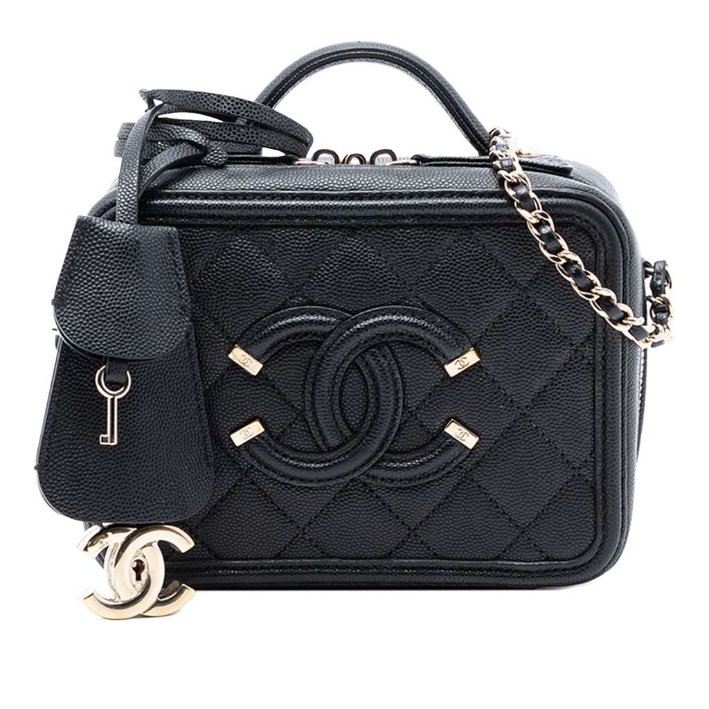 This satchel features a caviar leather body, flat top handle, a leather woven chain strap, a zip-around closure, and interior slip pockets.