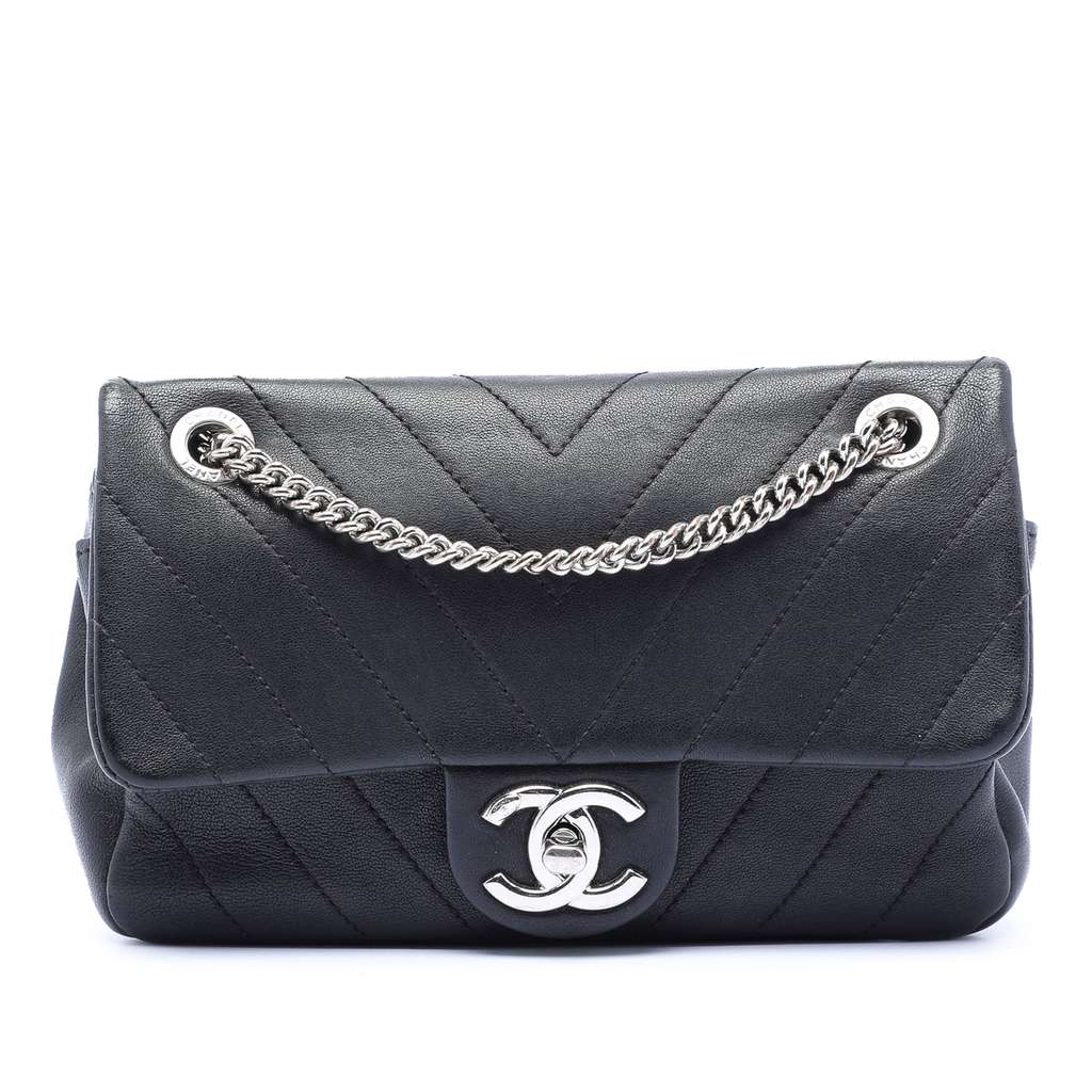 This flap bag features a quilted leather body, a chain strap with leather shoulder guard, a front flap with CC turn lock closure, an exterior back slip pocket, and an interior slip pocket. Exterior corners are repainted.