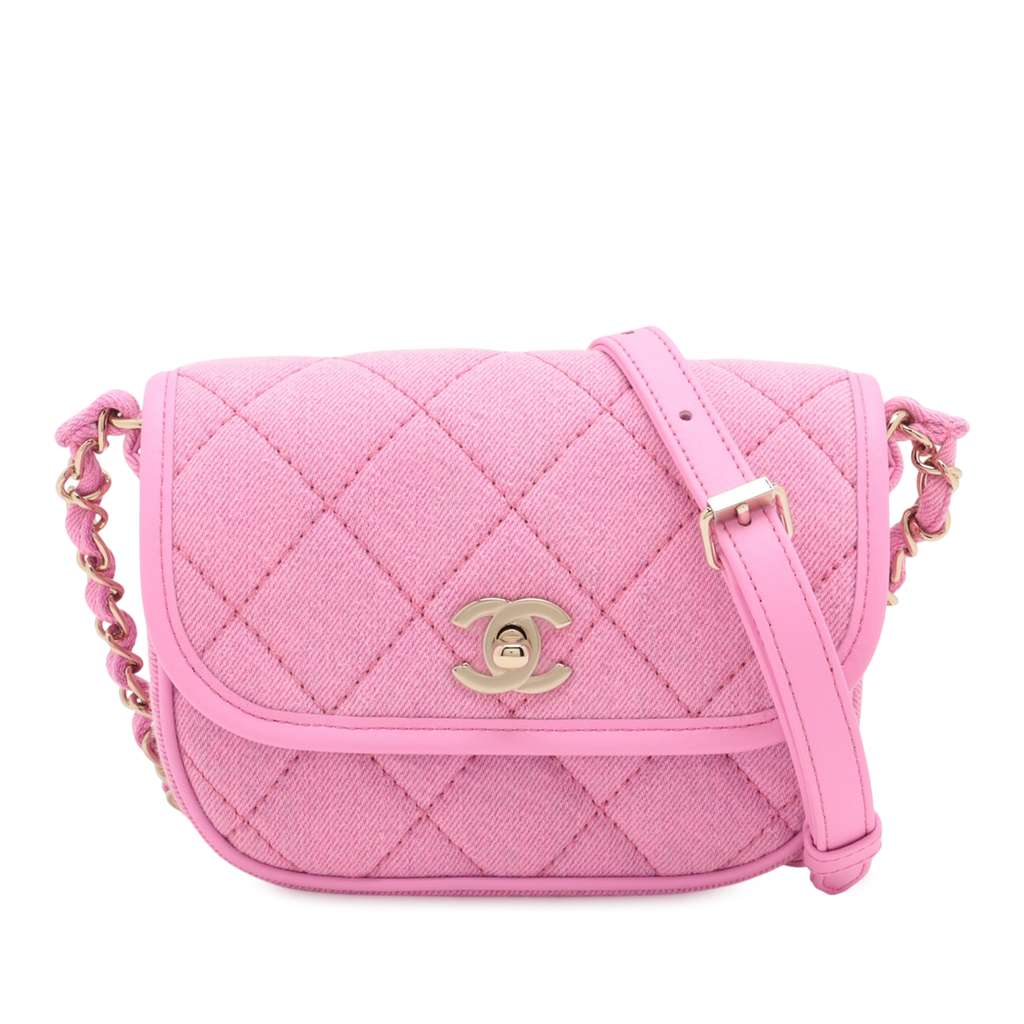 This crossbody features a quilted denim body with leather trim, a denim woven chain strap with leather guard, a front flap with CC twist-lock closure, an exterior back slip pocket, an under flap slip pocket, and an interior slip pocket.